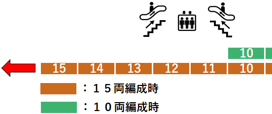 10両編成時・15両編成時共に停止位置(号車およびドアの位置)は共通です。 ※ただし、10両編成は、11号車から15号車(北改札方面)にあるエレベーター・エスカレーター付近には停車しません。