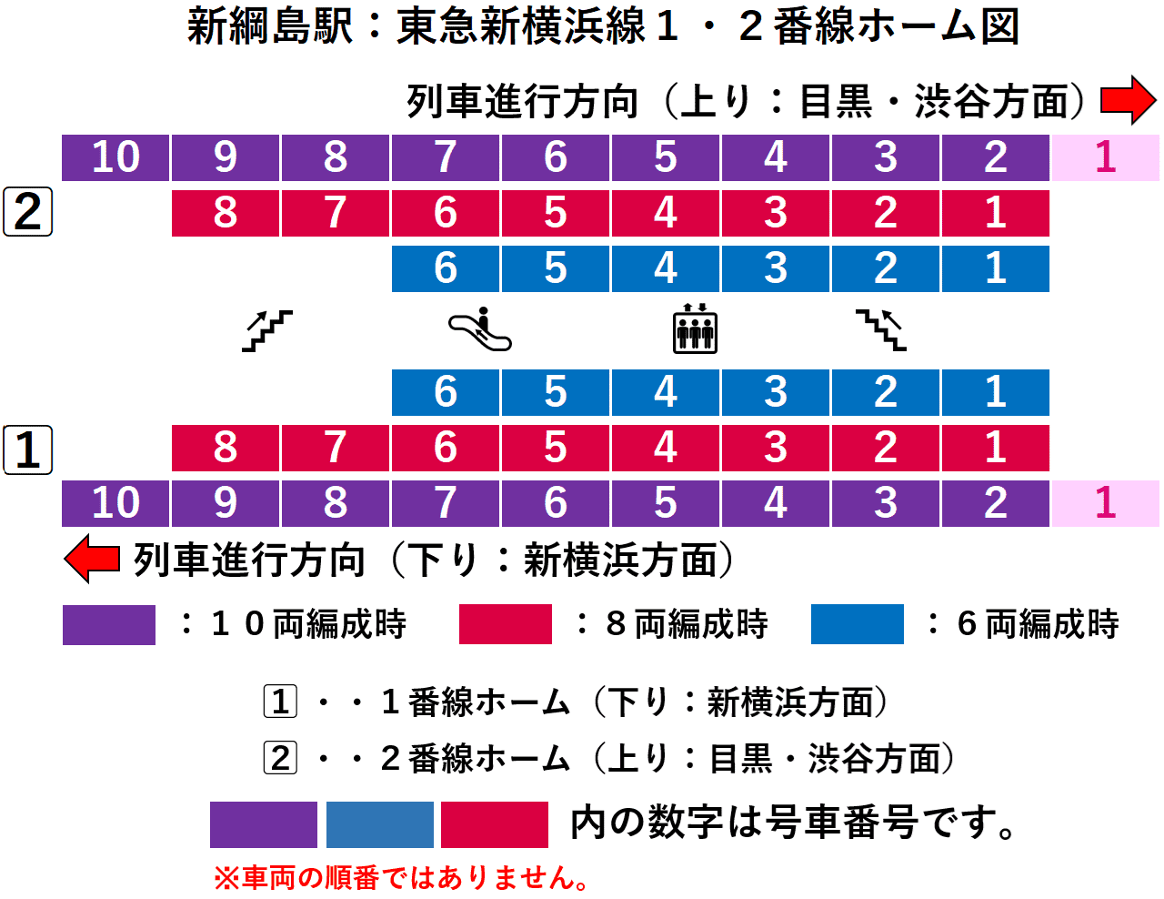 - 渋谷・池袋方面、目黒・西高島平・浦和美園方面行きの先頭が1号車で、新横浜方面行きの先頭が10号車(10両編成時)、8号車(8両編成時)、6号車(6両編成時)です。